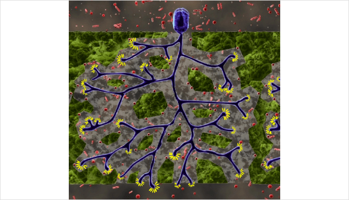 - AMAFERM可促进真菌菌糸(蓝色)和纤维降解菌(红色)成长并加速纤维分解。(右图)